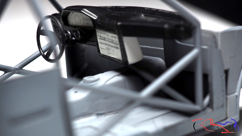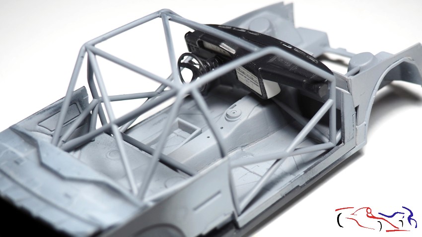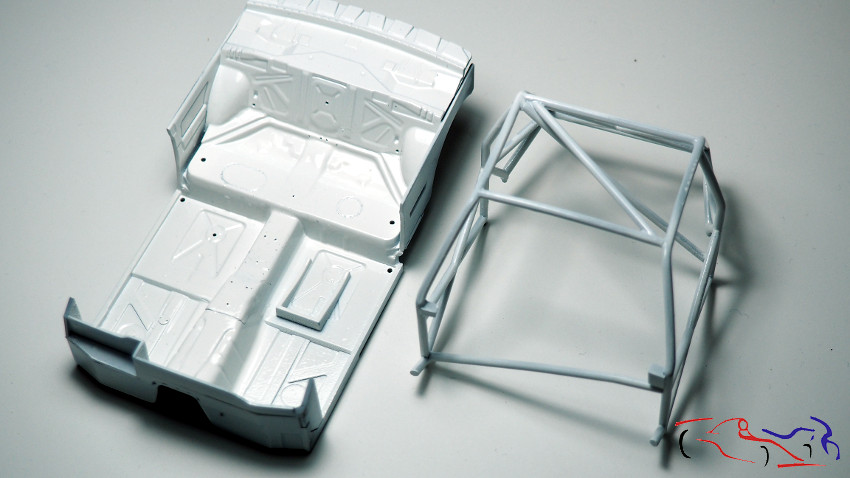 Mientras tanto, pinto de blanco LP de tamiya la cuna y el arco de seguridad, habiendo realizado agujeros en el cockpit para los distintos aparatos, entradas de cable o sopòrtes de lo que vaya a incluir.