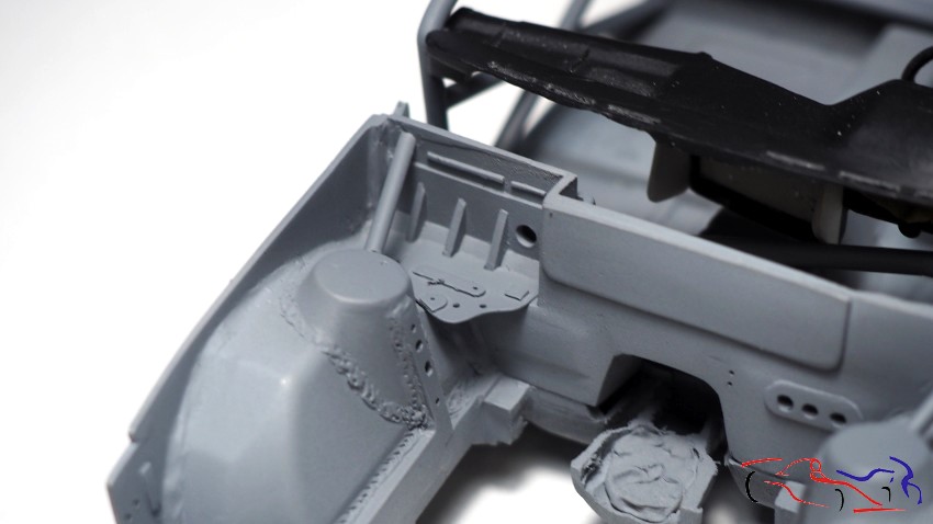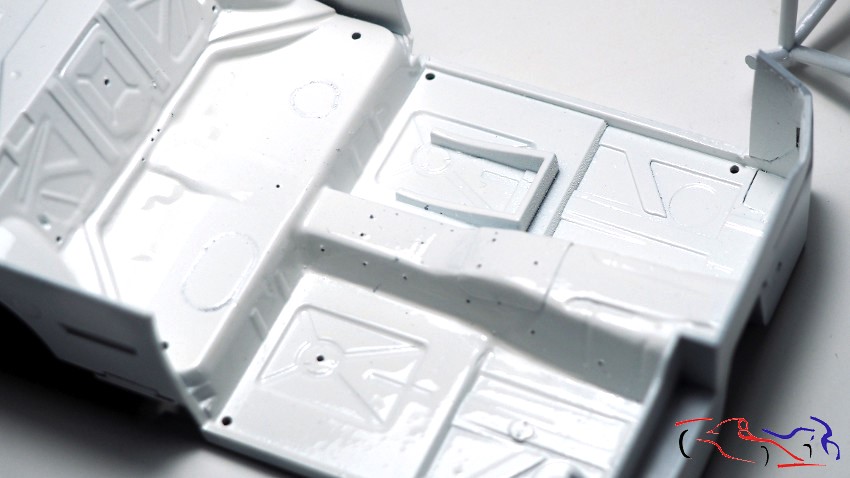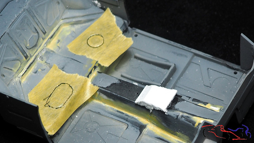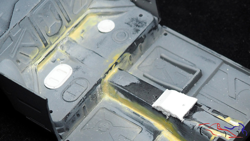We moved on to the cockpit. Right where the gearshift is, the car has a reinforcement, which I made from a wine bottle capsule. But the kit was the wrong shape, since in the real car, the plane change in the transmission tunnel is further back. Therefore, we added several pieces of plastic sheeting glued together. We took the opportunity to remove the access panels at the rear, to make new ones from scratch. Once the glue was dry, I sanded it down and applied UV putty all over, which I cured under the appropriate light.
