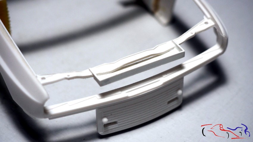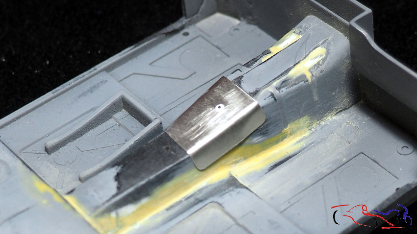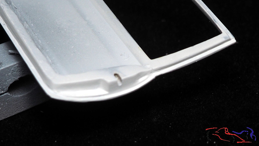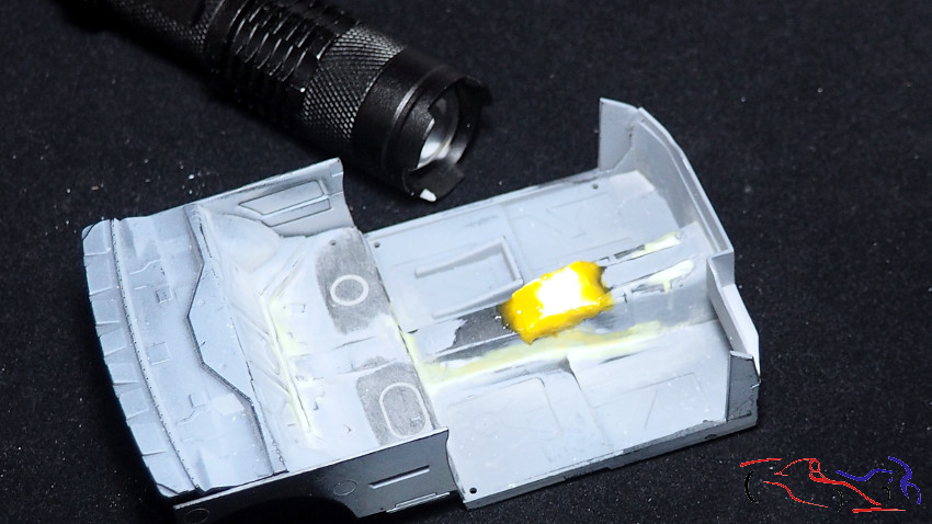 Pasamos al cockpit. Justo donde va la palanca de cambios, el coche lleva un refuerzo, que hice con capsula de botella de vino. Pero el kit tenía una forma no correcta, ya que en el coche real, el cambio de plano en el tunel de la transmisión más retrasado. Por tanto, añadimos varios trozos de láminas de plástico pegadas entre ellas. Aprovechamos a eliminar los registros de la parte trasera, para fabricar unos desde cero. Una vez seco el pegamento, lo limo y le pongo masilla UV por todos lados, que hago curar con la luz correspondiente.