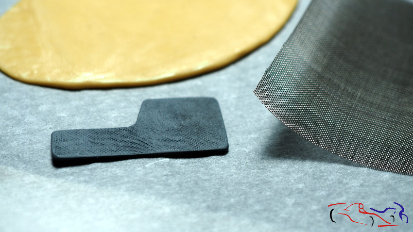 We moved on to the door trim, which we left unfinished except for the center section. Looking at photos of a Bigazzi M3, the one Perez Sala was driving in this race, the interior was like sofa upholstery, almost like fabric. Thinking about how to replicate it, I saw that Tameo’s grilles were very similar, so I got to work. Using epoxy putty, I made a ball, placed it between two pieces of parchment paper, and rolled it out with a roller (the thick handle of a utility knife) until it was as thin as possible. Once thinned, I placed the mesh on top and rolled it again with the utility knife handle to imprint the pattern onto the putty. The next step, once it was dry, was to trace it with the sample and cut off the excess, then smooth it down with files and sandpaper. I also reduced its thickness as much as possible so it would be flush with the rest of the trim.
