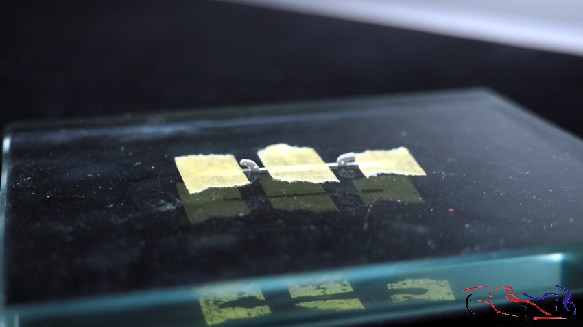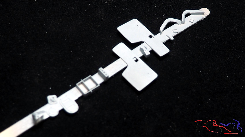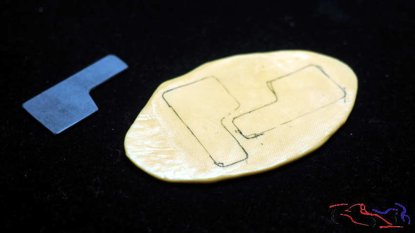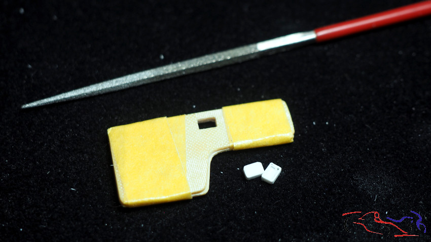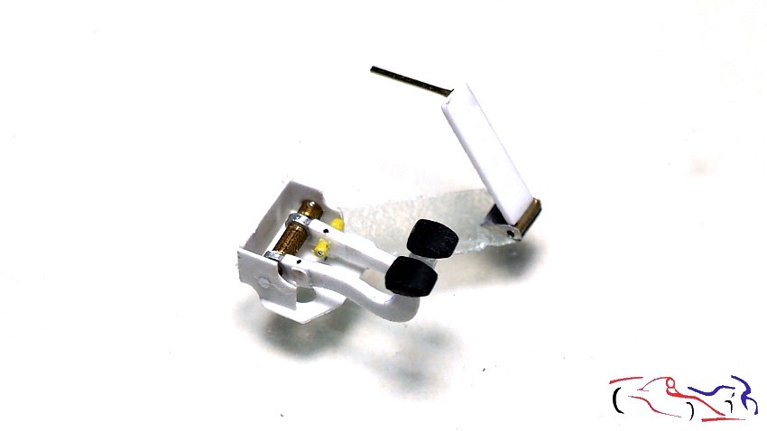 Una vez lijada la resina UV y con la pieza pegada, necesitamos hacer los pedales y el reposapies. EMpezando por este último, hacemos una máscara marcando los bordes de corte asi como el lugar donde va el acelerador, y el hueco a la izquierda donde va el reposapies del pie izquierdo. Lo pasamos a una lámina de plástico y vemos su encaje. A su vez comenzaamos a dar forma a los pedales, teniendo el pedal de embrague y freno en un conjunto, y el acelerador por separado. Estos se han realizado con plástico tallado, tiras y redondos de plástico, y tubos de metal.