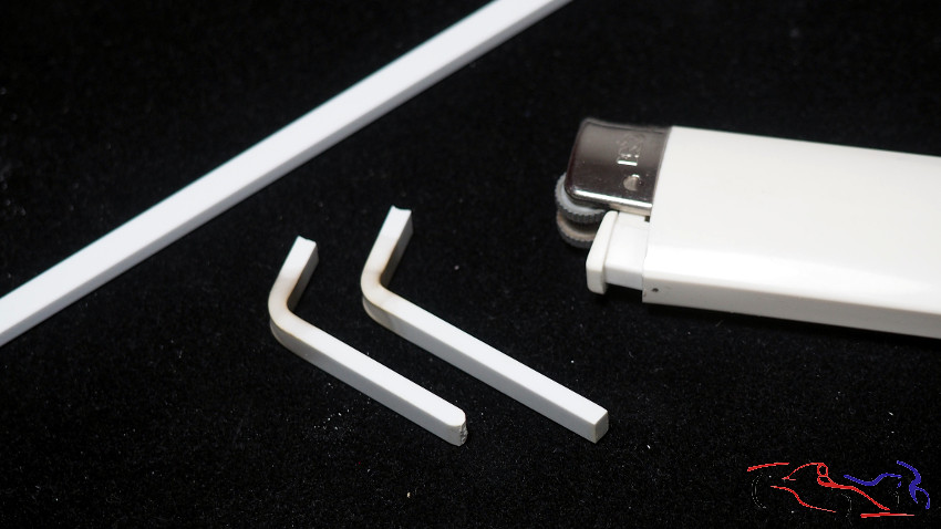 The next step was to make the handles (or armrests). I took plastic rod, which I bent with heat, and then cut and shaped it with files and sandpaper, giving it the correct form. You can see the resin piece I made with epoxy putty in the second photo.