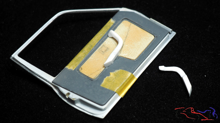 Continuamos con el interior, recreando la pieza donde van los fusibles, situada al lado del asiento, sobre el tunel central. Como son 8 fusibles, empiezo cortando y pegando una tira a la que he redondeado un poco las aristas, para que al pegarlos entre si, con ayuda de un soporte metálico, den la sensación de bloques distintos. Posteriormente, se añaden trocitos de redondo de plástico como si fueran las tapas donde van los propios fusibles, y se pega el cojunto a un soporte realizado en plástico como se ve en la segunda foto. Además, cada uno de esos fusibles lleva conectado en su parte inferior, un cable con una capucha de goma, que realizo con una camisa de cable que agrando e introduzco en el propio cable rojo. Más adelante lo cortaré y lo pegaré a cada fusible previo agujero hecho con broca de 0,3 mm.