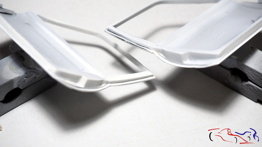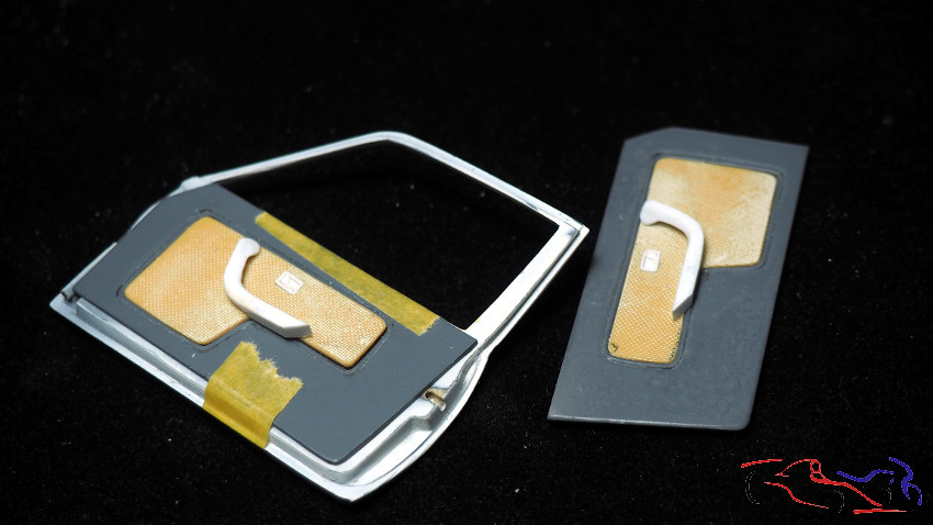 We continue with more trim pieces, and now it’s the door handle’s turn. I made it from plastic, later drilling holes for it in the epoxy putty piece. To make sure they were in the same place, I joined the pieces from both doors. You can see that we don’t always make the pieces the same size…