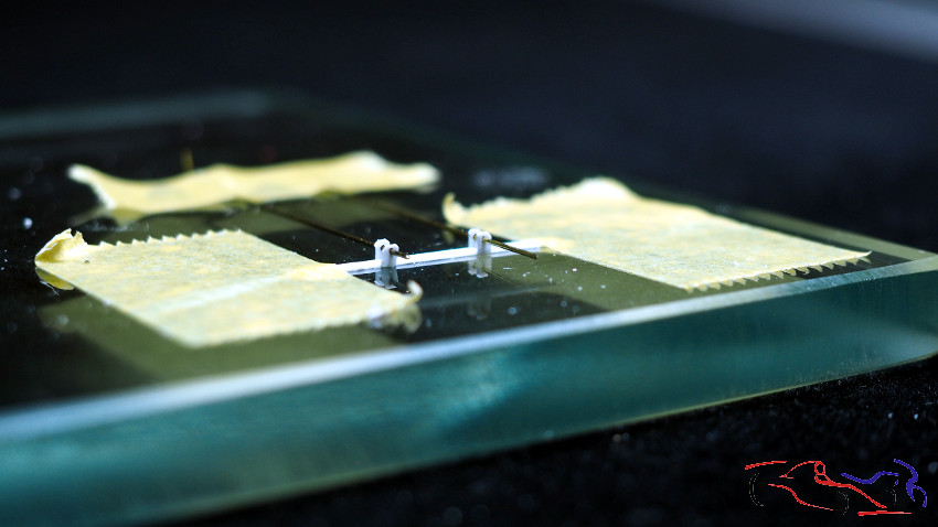 Y después de mostrar como va el conjunto, pasamos a las piezas nuevas que he realizado. Empezamos con los cierres y bisagras del capó. La primera foto, os muestro las fijaciones del capó, que van situadas en la parte más cercana al cristal. Están realizadas con plasticar con sus respectivos agujeros. En las dos siguientes fotos, vemos las piezas que irán en el capó, en la parte delantera, y donde se abatirá para abrirse. Los extremos de los palitos verticales irán colocados en la parte del chasis, en la bandeja que he mostrado anteriormente.