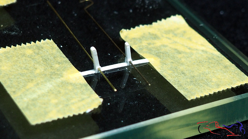 Meanwhile, I paint the cradle and safety arch with Tamiya LP white, having made holes in the cockpit for the various devices, cable entry points or supports for whatever I am going to include.