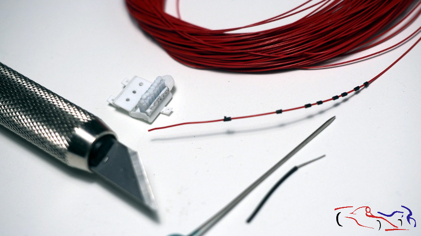 We continue with the interior, recreating the fuse box located next to the seat, above the central tunnel. Since there are eight fuses, I start by cutting and gluing a strip of material with slightly rounded edges. This way, when glued together with a metal support, they’ll appear as distinct blocks. Next, small pieces of round plastic are added as fuse covers, and the assembly is glued to a plastic support, as seen in the second photo. Each fuse also has a wire with a rubber boot connected to its underside. I make this boot from a length of wire insulation, which I enlarge and insert into the red wire. Later, I’ll cut the rubber boot and glue it to each fuse after drilling a 0.3 mm hole.