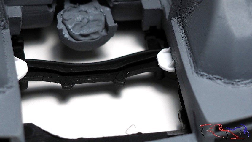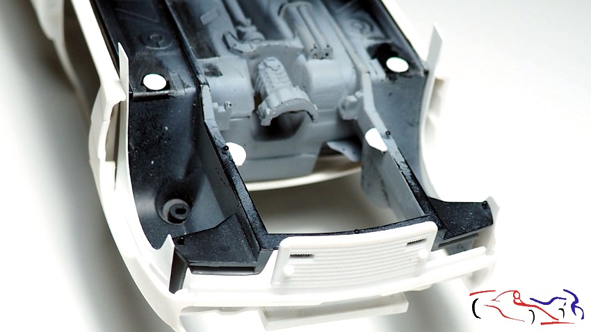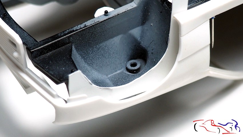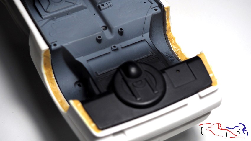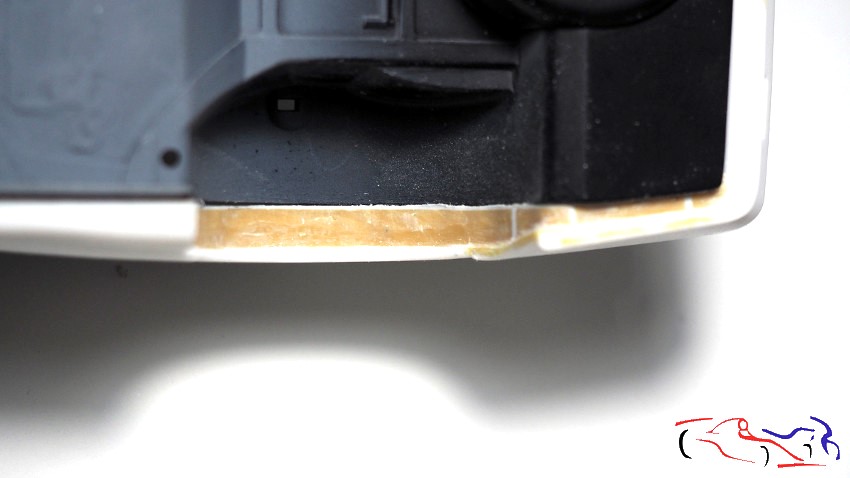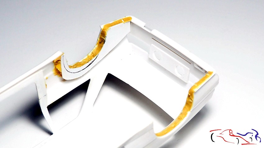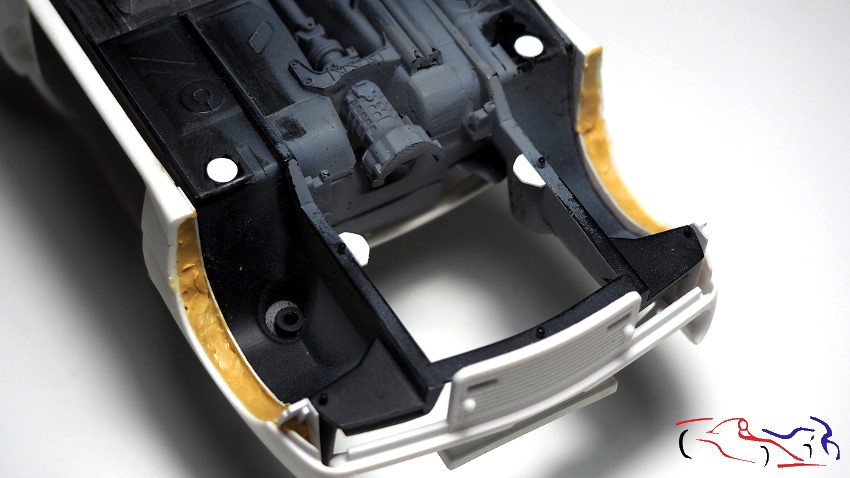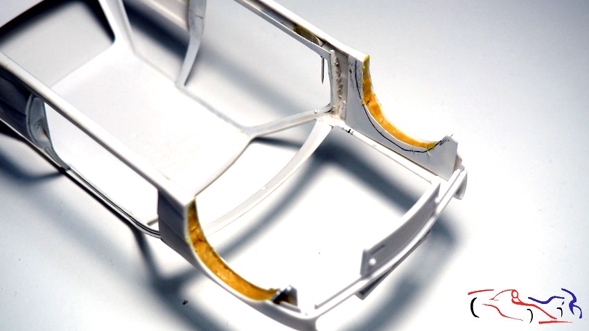 Continuing with the chassis, it’s time to complete the wheel arches that don’t extend to the body. The method is the same as I used on the Rothmans Porsche 911: apply plastic to the chassis without gluing it, and fill the gaps with epoxy putty on the bodywork. Once dry, I separate the chassis and work on the wheel arches on the body, trimming the plastic and sanding the putty. First, we see the plastic sheets in place, unglued: