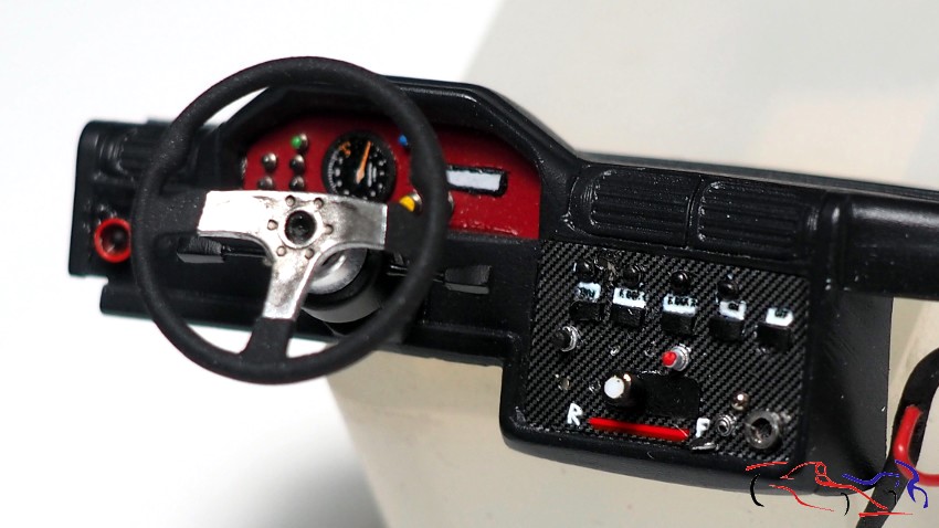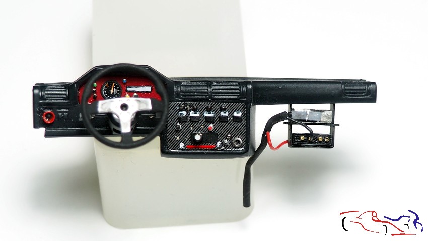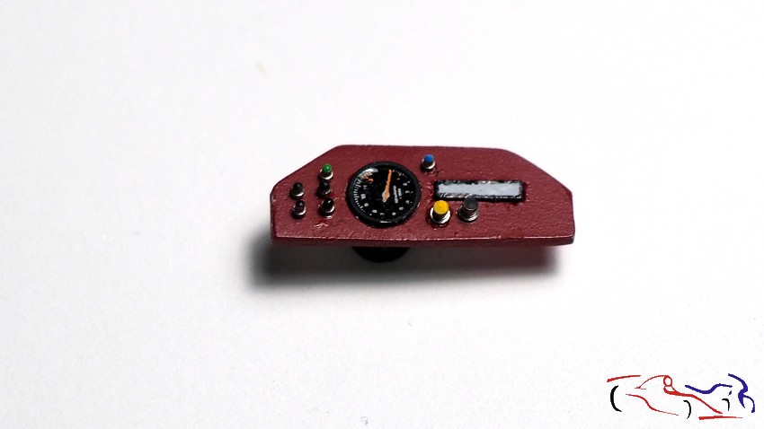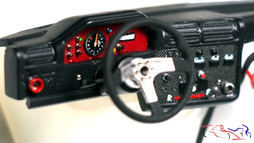 And with that, and many more small pieces, we finished the dashboard. The fiberglass decals and button indicators are particularly noteworthy, as are the different types of switches, some of which are painted.