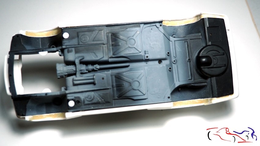 Siguiendo con el chasis, el turno es para completar los pasos de rueda que no llegan hasta la carrocería. El método es el mismo que use en el Porsche 911 Rothmans: poner plástico sin pegarlo al chasis, y rellenarlo con masilla epoxy en la parte de la carrocería. Una vez seco, separo el chasis y trabajo los pasos de rueda en la carrocería, recortando el plástico y lijando la masilla. Primero vemos las láminas de plástico en su lugar, sin pegar:
