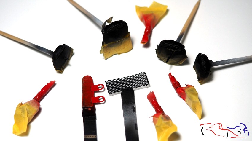 A continuación, y para dar un poco de color, os muestro varias piezas pintadas: en rojo, los amortiguadores y los ganchos delantero y trasero, en negro, un radiador de fotograbado y las pinzas de los frenos, que previamente había pintado en color metálico: