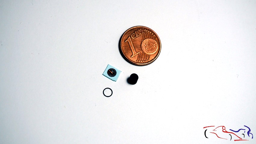 We move on to the instrument cluster on the dashboard. For the main gauge, I cut a metal rod and take a photo-etched ring, which I prime and paint black. Then, I’ll apply the decal and, using UV resin, glue the ring in place, creating a transparent film to mimic the glass. In the photo of the finished piece, we can see other accessories painted in different colors: