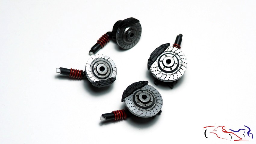 Y para terminar, los conjuntos de frenos-amortiguadores ya terminados. Los muelles fueron pintados enmascarando el negro base, repasándolos posteriormente con un rotulador rojo permanente, y un poco de Panel Liner de Tamiya. Los discos tienen el fotograbado correspondiente del coche, con una aplicación del panel liner.